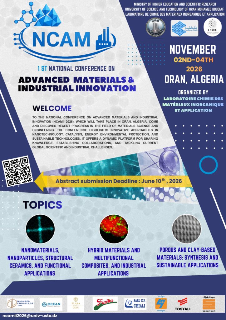 The LCMIA Laboratory is pleased to announce the organization of the 1st National Conference on Advanced Materials and Industrial Innovation (NCAMII-2026), which will be held in Oran from November 2nd to 4th, 2026, and aims to bring together researchers, academics, doctoral students, experts, and professionals to foster scientific exchange, present recent research work, and discuss current advances and challenges in the fields of advanced materials and industrial applications, while promoting collaboration, innovation, and knowledge sharing through a program including plenary lectures, oral presentations, thematic sessions, and networking opportunities.