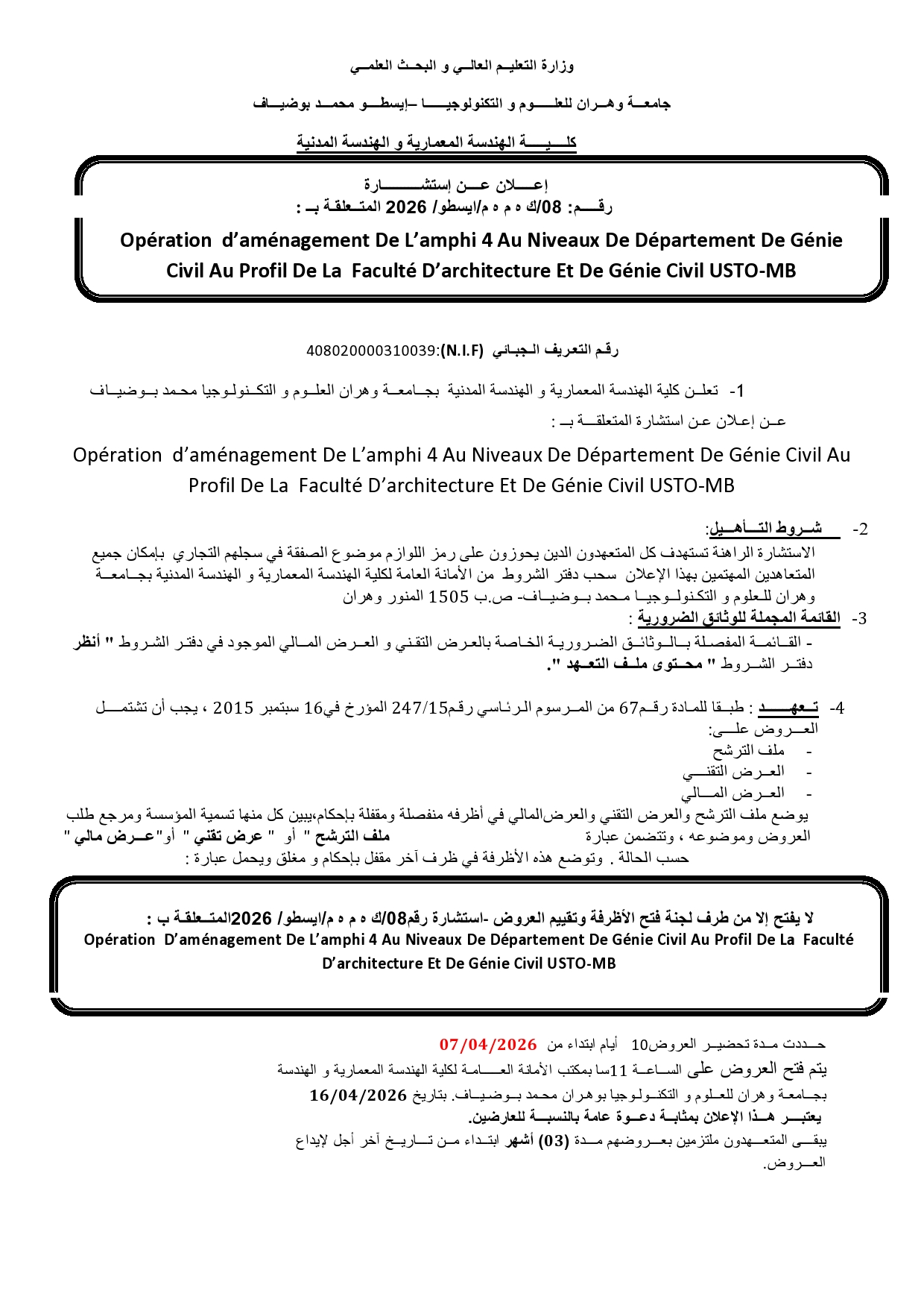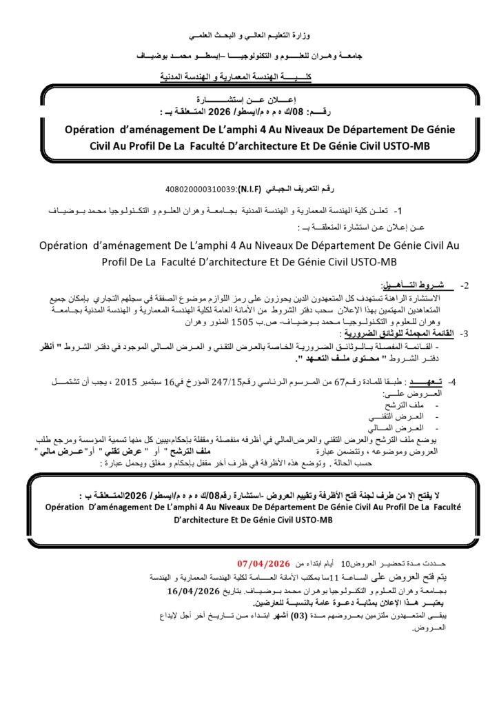 عملية تهيئة المدرج رقم 4 على مستوى قسم الهندسة المدنية لصالح كلية الهندسة المعمارية والهندسة المدنية – جامعة وهران للعلوم والتكنولوجيا محمد بوضياف