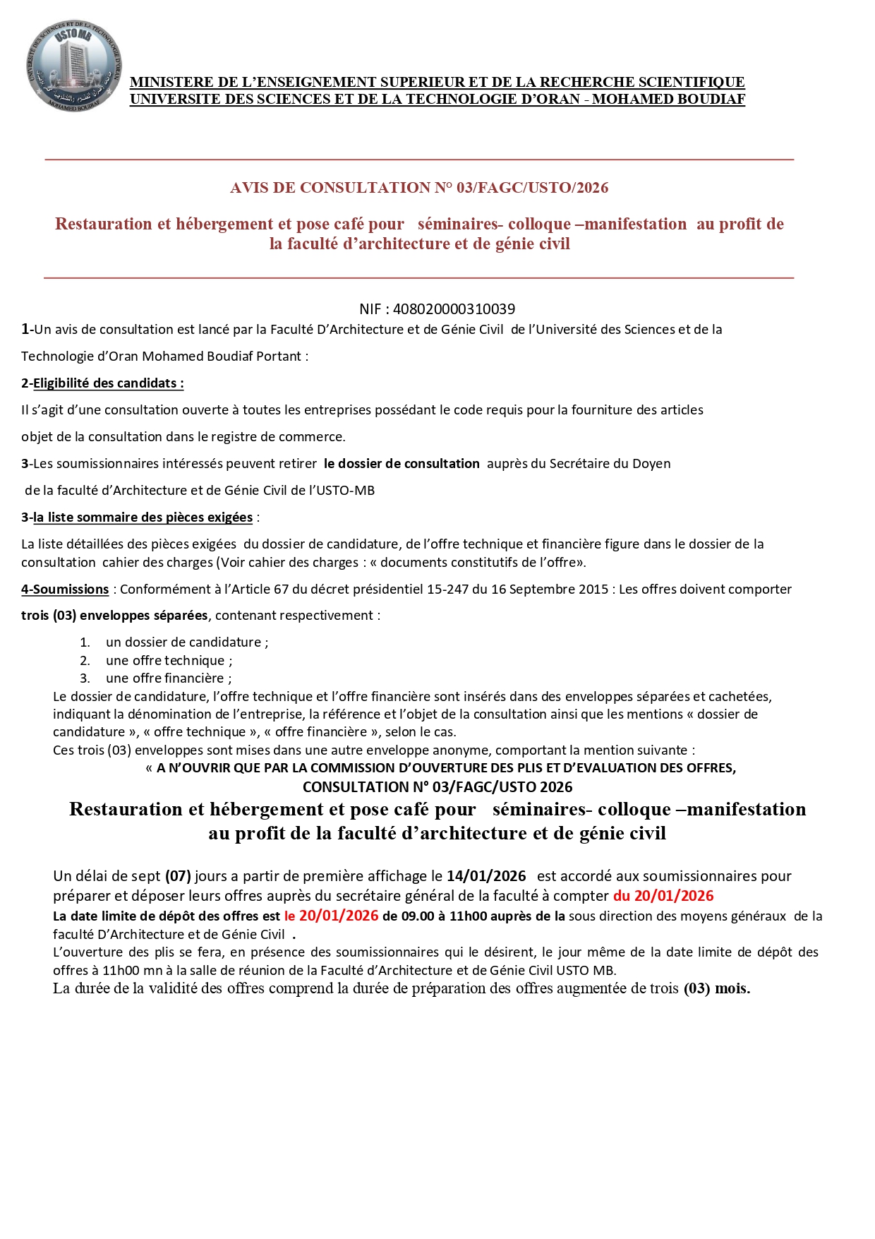 AVIS DE CONSULTATION N° 03/FAGC/USTO/2026 janvier 18, 2026janvier 18, 2026 amina mimoun PORTANT : «Restauration et hébergement et pose café pour séminaires- colloque –manifestation au profit de la faculté d’architecture et de génie civil».Télécharger