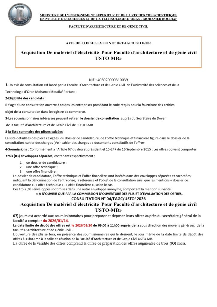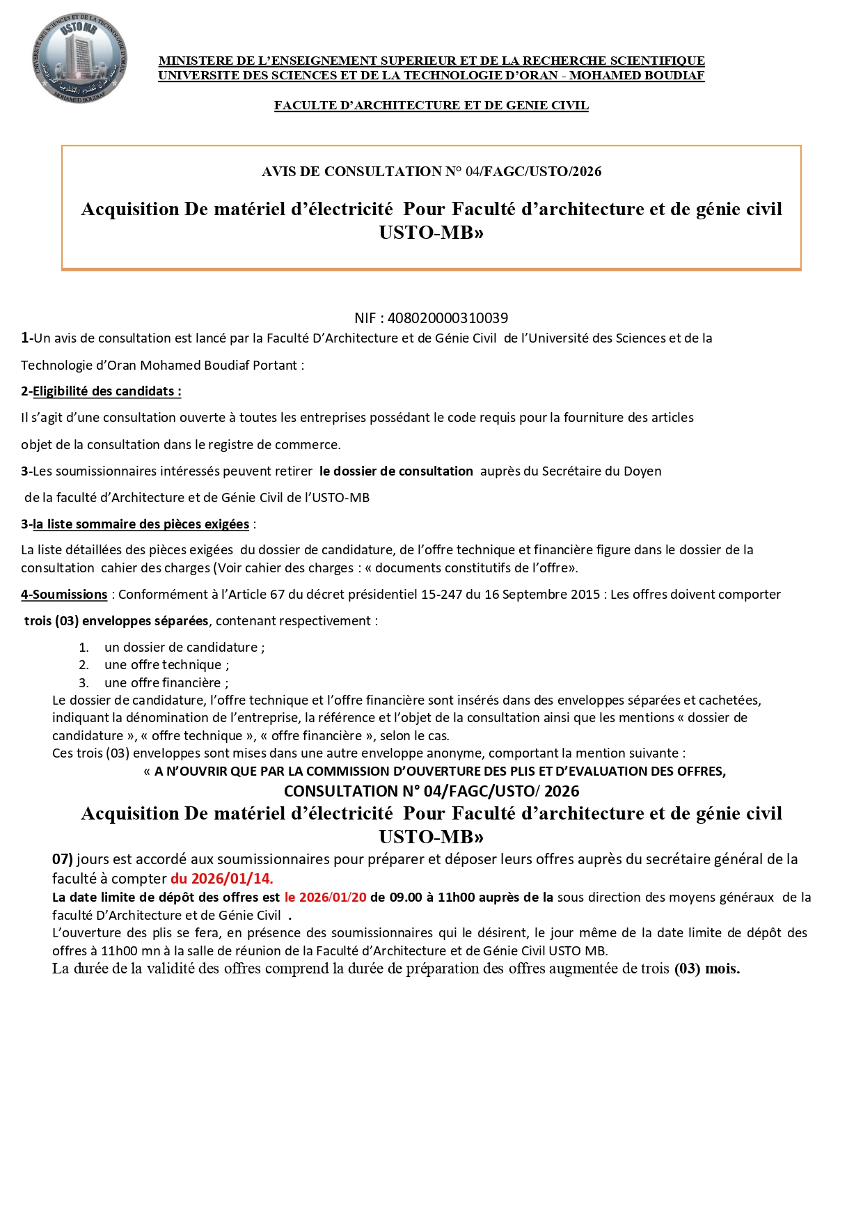 AVIS DE CONSULTATION N° 04/FAGC/USTO/2026 janvier 18, 2026janvier 18, 2026 amina mimoun PORTANT : «Restauration et hébergement et pose café pour séminaires- colloque –manifestation au profit de la faculté d’architecture et de génie civil».Télécharger