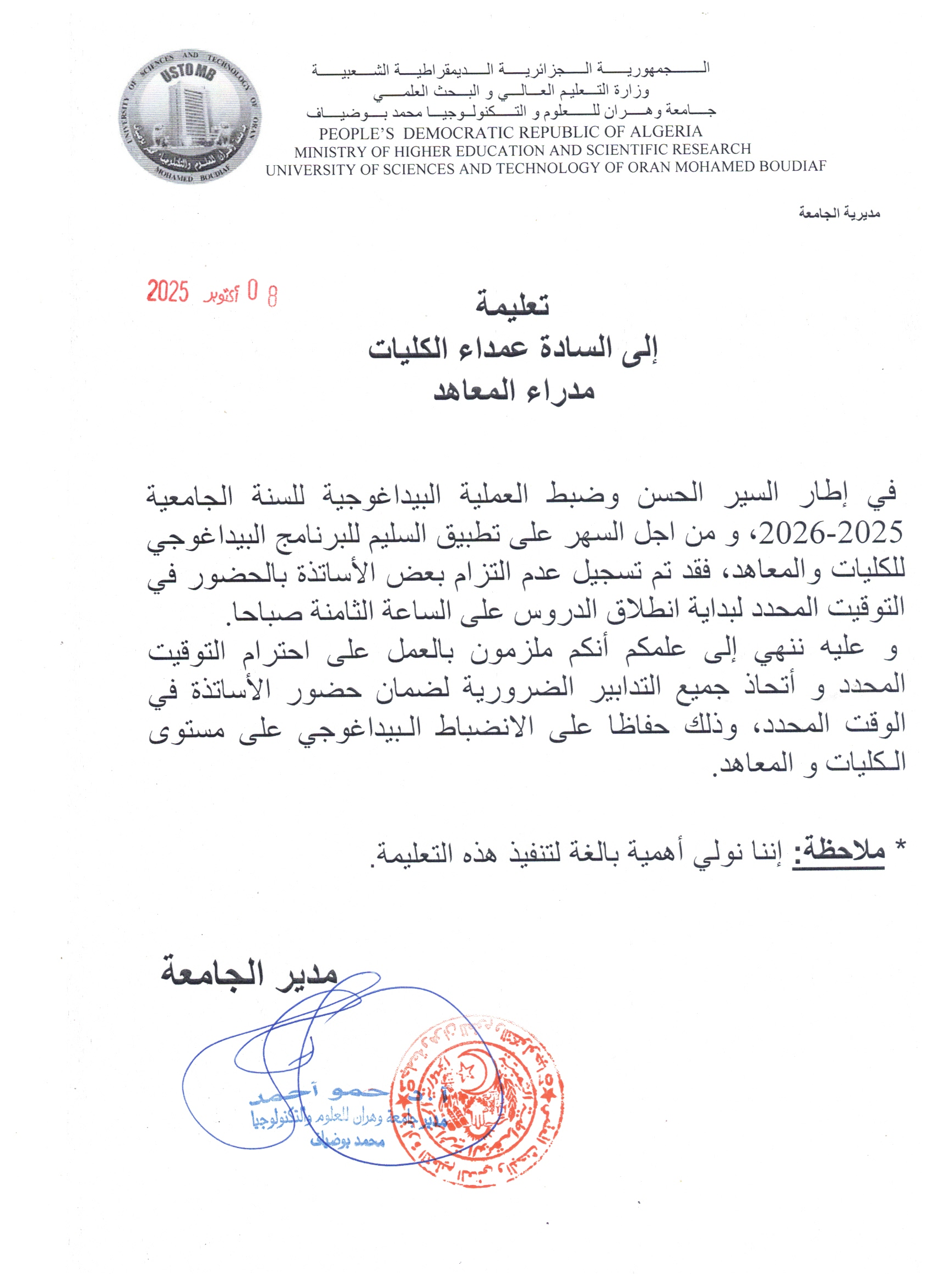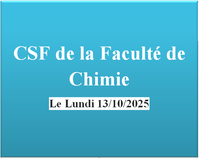 Faculté de Chimie Search for: Numérisation_20251008Publication Instagram La Gestion du Temps et du Stress Beige VertPNR 4passcartecsfNavy Modern Research PresentationCapture d’écran 2025-09-21 122137master nvsm vers chbourselaborechquitusdoctoratCapture d’écran 2024-10-27 140517Enseignement à distancerelevé authident des docvacationcours en lignechoix enseignementInscription doctorat New Avis aux étudiants en 1ère année ingénieur « Génie des procédés » Veuillez récupérer vos cartes d’étudiants au 1er bureau du vice décanat 3ème étage Mise à jour des emplois du temps de département Chimie physique Fiche d'identification des doctorants Assises sur la modernisation de l'ESS La nouvelle procédure de la demande de soutenance PROGRES Demande de Relevé de Notes et Authentification Demande d'attestation en français Départements Chimie Physique Génie Chimique Génie des Matériaux Actualités – Planning de CSD & CSF de la Faculté de Chimie 2024-2025– Portail des nouveaux bacheliers– Présentation de la Faculté de Chimie– Bulletin d’information USTO MB– Arrêtés pédagogiques Services de la graduation Authentification des relevés de notesDemande des relevés de notesشهادة الإنقطاع عن الدراسة وإلغاء التسجيل البيداغوجيCarte CHIFA CNASCours et fiches de TD en ligne A Consulter Documents à télécharger La Faculté en Chiffres E_Mail Professionnel E_Learning