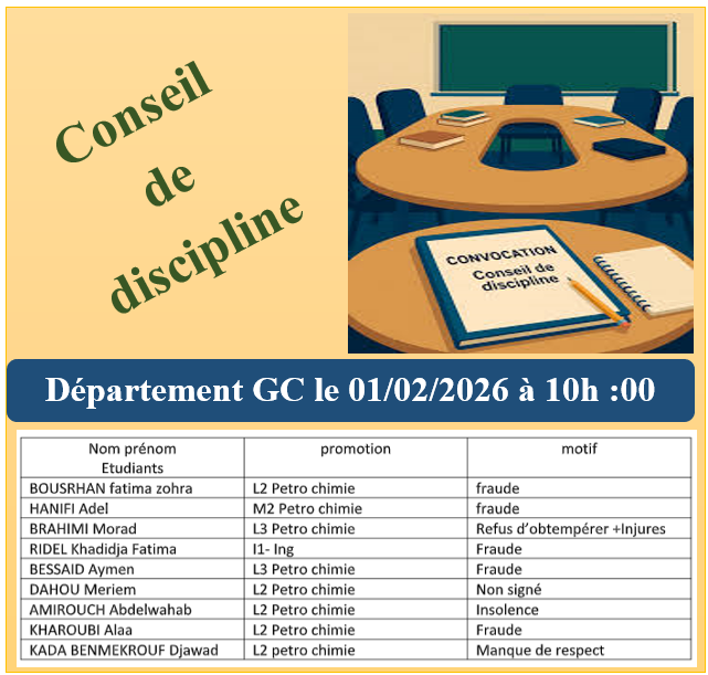Nous informons tous les étudiants du département de génie chimique que les examens de remplacement auront lieu les Mercredi 21 et le Jeudi 22 Janvier 2026.