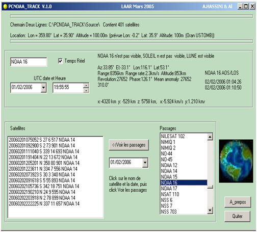 PCNOAA_TRACK est un calculateur de la prévision des passages satellitaires. Il a été conçu à partir d’une bibliothèque de liens dynamique DLL élaborée par D.J. Taylor (U.K), ce gère le modèle SGP4 pour les satellites basses altitudes et le modèle SDP4 pour les satellites géostationnaires.