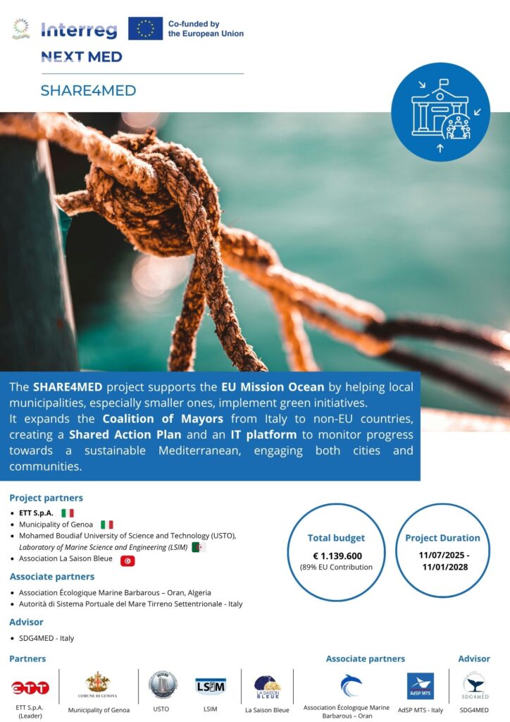 Le projet SHARE4MED, financé dans le cadre du programme Interreg NEXT MED et cofinancé par l’Union européenne, soutient la Mission européenne pour les océans en aidant les municipalités en particulier les plus petites à mettre en œuvre des initiatives vertes en faveur d’une Méditerranée durable. Ceci permettra d’étendre la Coalition des Maires (initialement basée en Italie) à des pays non membres de l’UE, en favorisant la coopération transméditerranéenne autour des politiques environnementales locales.